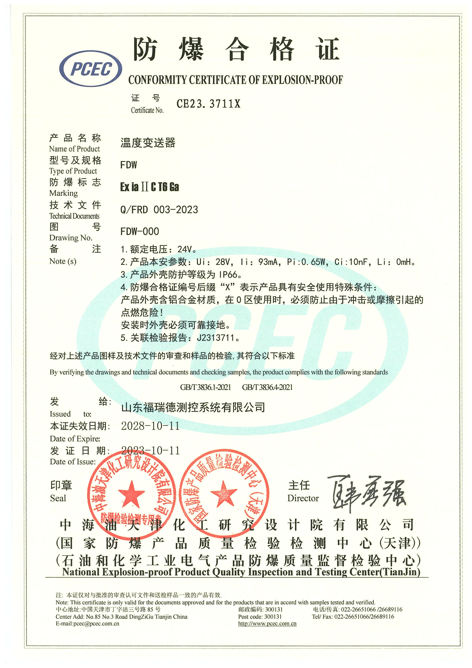 FDW温度防爆证-隔爆